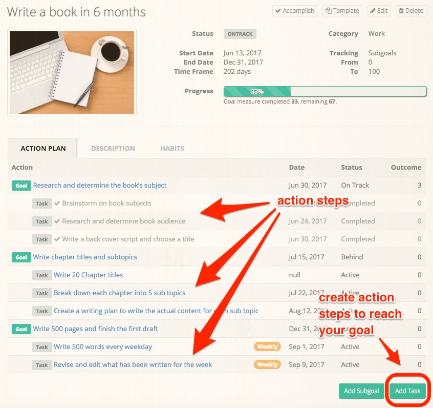 A well-defined action plan should include a clear and logical sub-goal and task structure, detailed notes on things like vision, purposes and resources, and also any helpful habits that may be helpful in achieving success in reaching the goal. Next you may want to check out how to effectively track your progress toward your goal.