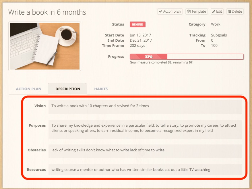 Aside from defining sub-goals and tasks for your goal, you may also consider a few important aspects such as your vision, purpose, obstacles and resources about your achieving goal. Spending some time planning out each of these areas will be very valuable. Click the Description tab on the goal details page.