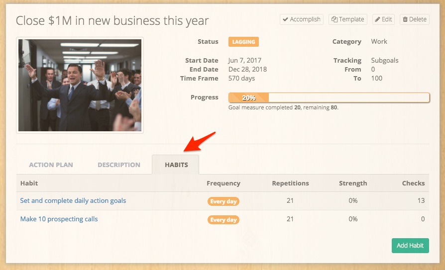 Click on the Habits tab to add any habits you want to build for your goal. These habits will also be visible on the Habits page. You can also edit habits to change their goal field to link them to a particular goal.