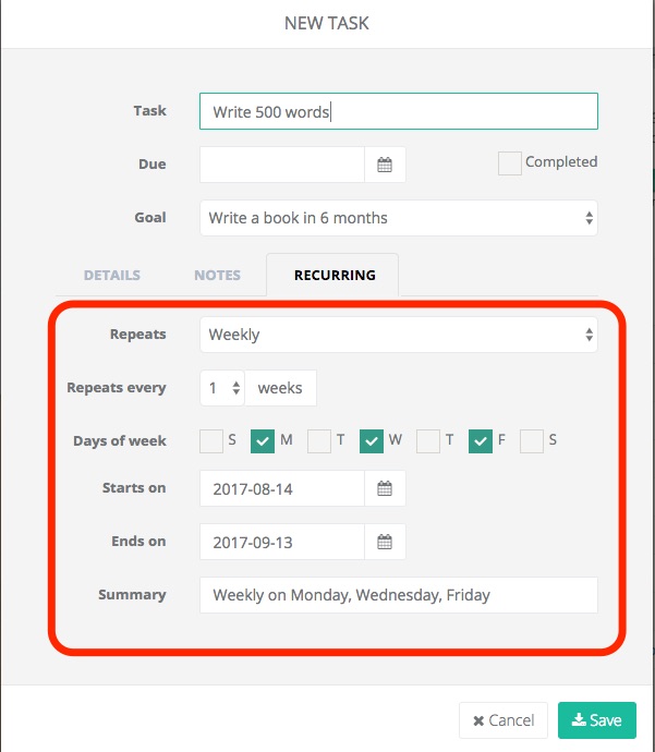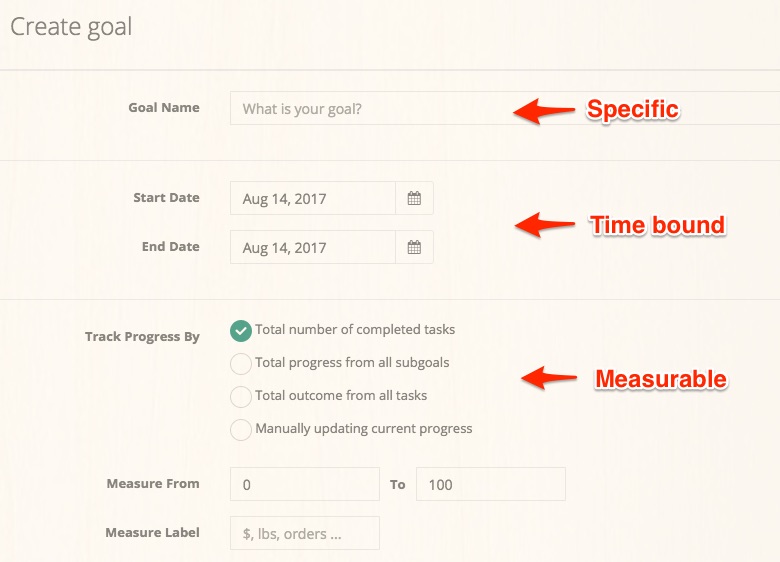 We encourage you to fill out as much information about your goal as possible. The more you think about your goal, the better chance you'll take action and thus make progress.