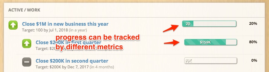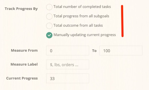 Four ways of progress tracking are provided in the software. Use the method that best fits your type of goals. Your sub-goals can use different metrics other than their main goal.
