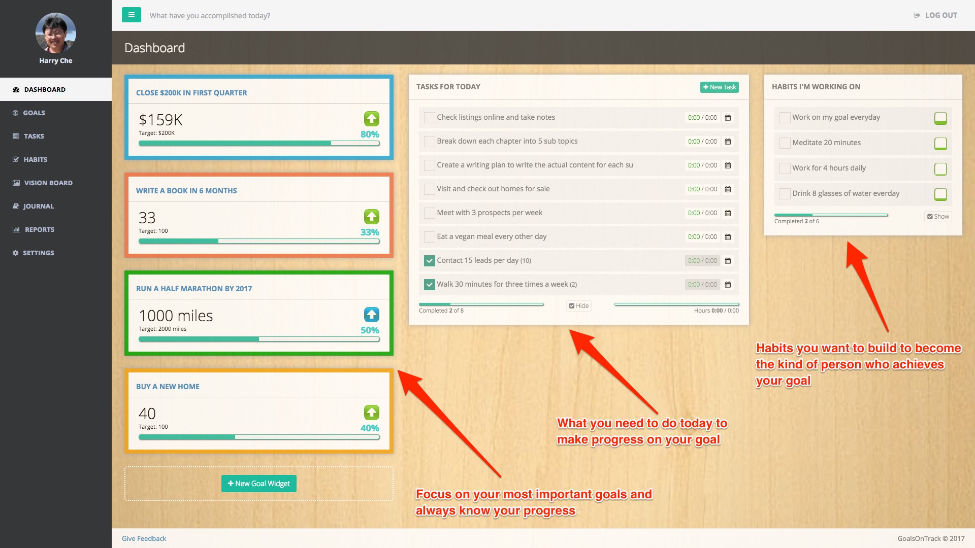 Your default screen is the main Dashboard page. Here you will have a quick overview of the most important goals and your progress. You'll also see your tasks for the day, and whatever habits you are working on.